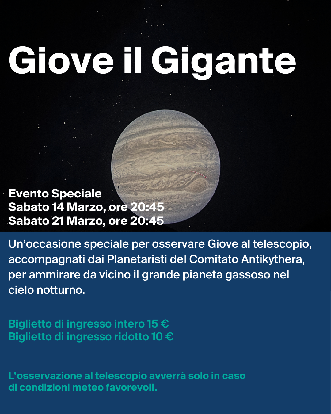 Sabato 14 e Sabato 21 Marzo alle ore 20:45, il Planetario di Imperia ospiterà l'evento speciale "Giove il Gigante": un’occasione speciale per osservare Giove al telescopio, accompagnati dai Planetaristi del Comitato Antikythera, per ammirare da vicino il grande pianeta gassoso nel cielo notturno.