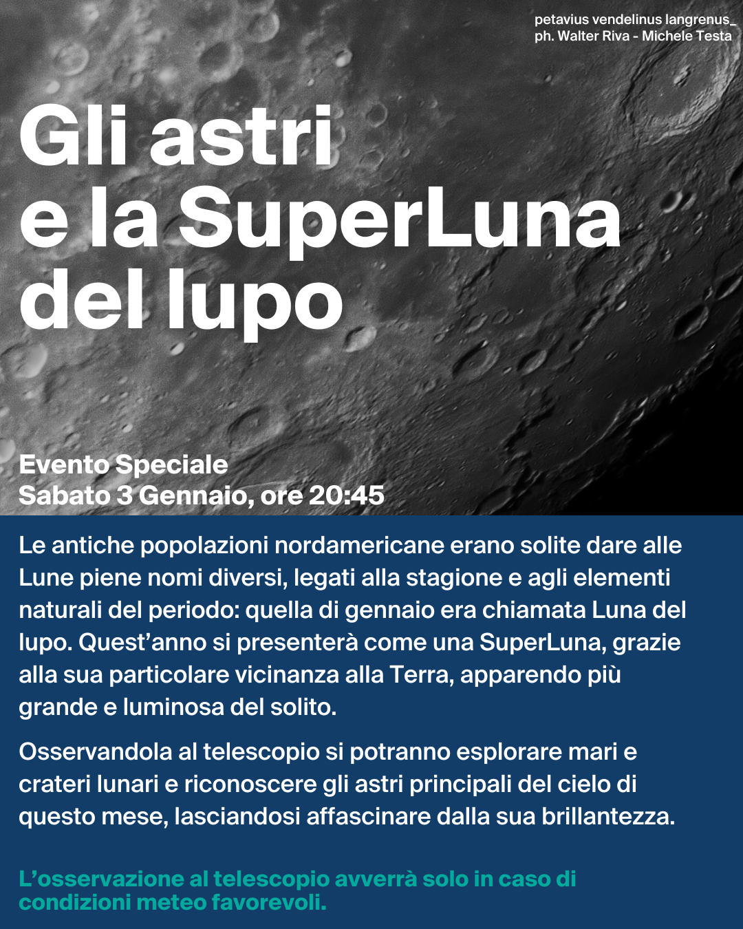 Sabato 3 gennaio alle 20:45 la Luna sarà protagonista di un evento speciale dedicato alle tradizioni delle antiche popolazioni nordamericane, accompagnato da un’osservazione al telescopio e da una proiezione in Planetario.