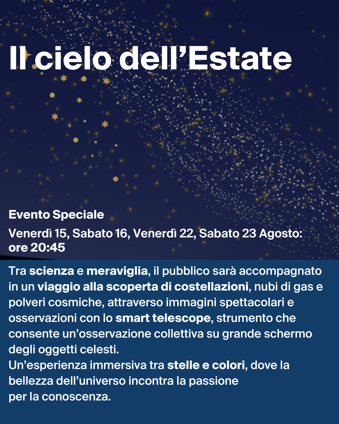 Venerdì 15, Sabato 16, Venerdì 22 e Sabato 23 Agosto alle ore 20:45 il pubblico sarà accompagnato in un viaggio alla scoperta di costellazioni, nubi di gas e polveri cosmiche, attraverso immagini spettacolari e osservazioni con lo smart telescope, strumento che consente un’osservazione collettiva su grande schermo degli oggetti celesti.