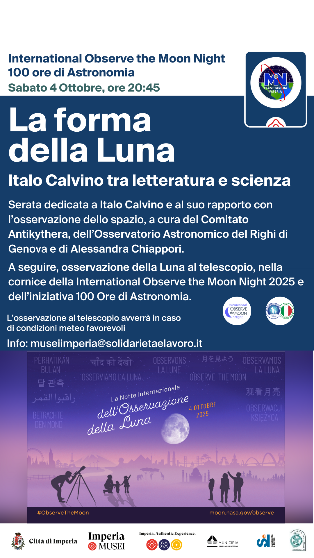 A seguire, osservazione della Luna al telescopio insieme ai planetaristi del Comitato Antikythera, nella cornice della International Observe the Moon Night 2025 e dell’iniziativa 100 Ore di Astronomia.