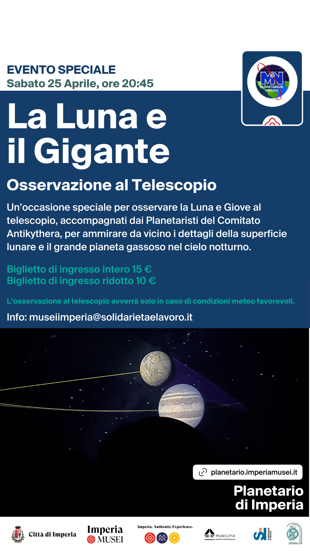 Sabato 25 Aprile alle ore 20:45, il Planetario di Imperia ospiterà l'evento speciale "La Luna e il Gigante": un’occasione speciale per osservare la Luna e Giove al telescopio, accompagnati dai Planetaristi del Comitato Antikythera, per ammirare da vicino i dettagli della superficie lunare e il grande pianeta gassoso nel cielo notturno.