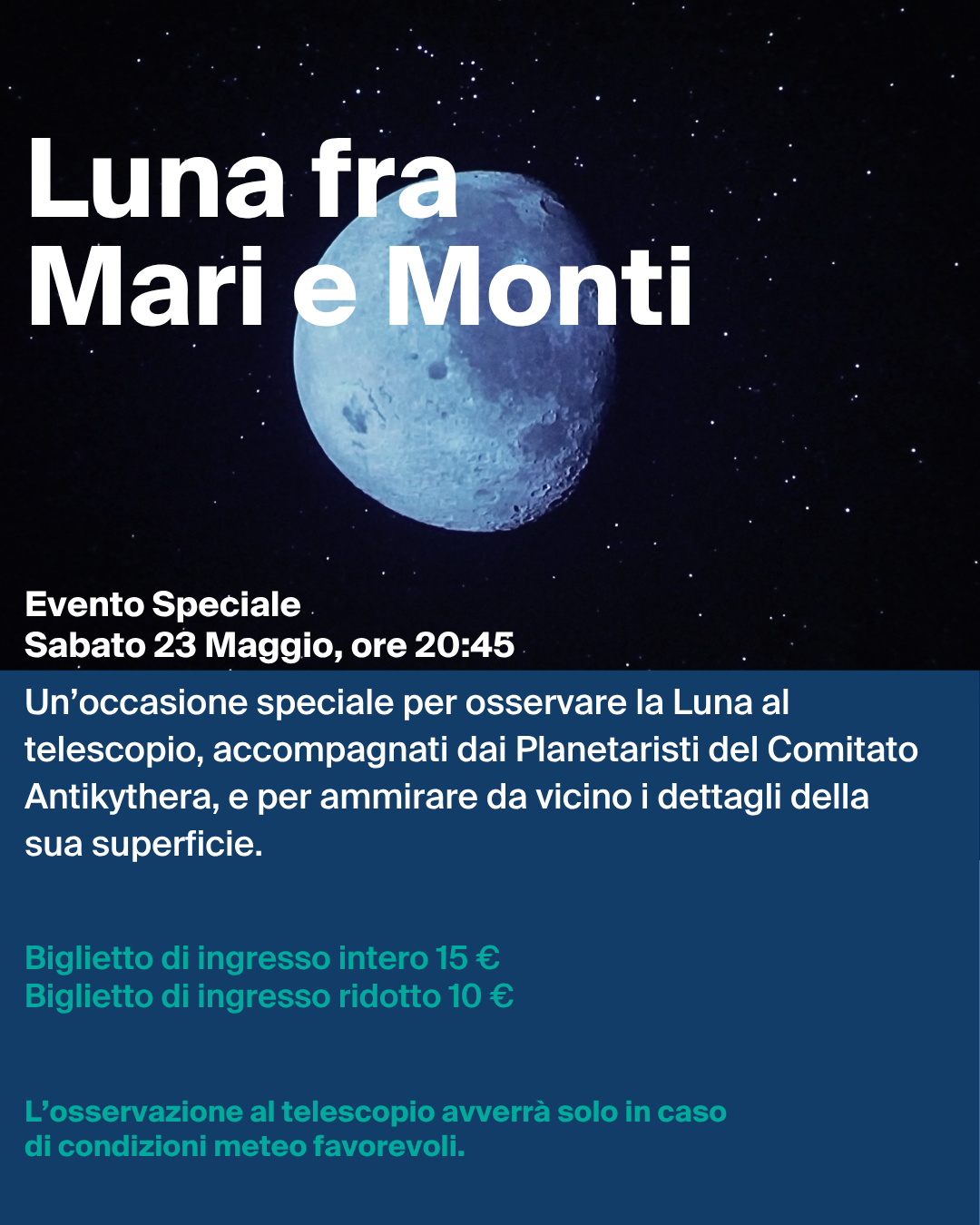 Sabato 23 Maggio alle ore 20:45, il Planetario di Imperia ospiterà l'evento speciale "Luna fra Mari e Monti": un’occasione speciale per osservare la Luna al telescopio, accompagnati dai Planetaristi del Comitato Antikythera, per ammirare da vicino i dettagli della sua superficie.