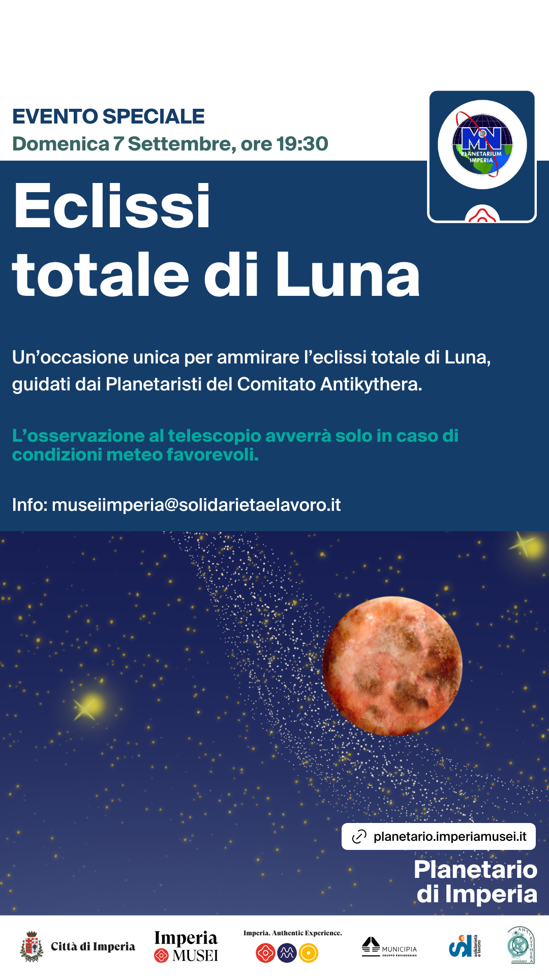 Domenica 7 settembre alle ore 19:30, il pubblico sarà accompagnato alla scoperta dell'universo attraverso un Evento Speciale, a cura del Comitato Antikythera, in occasione dell'Eclissi totale di Luna.