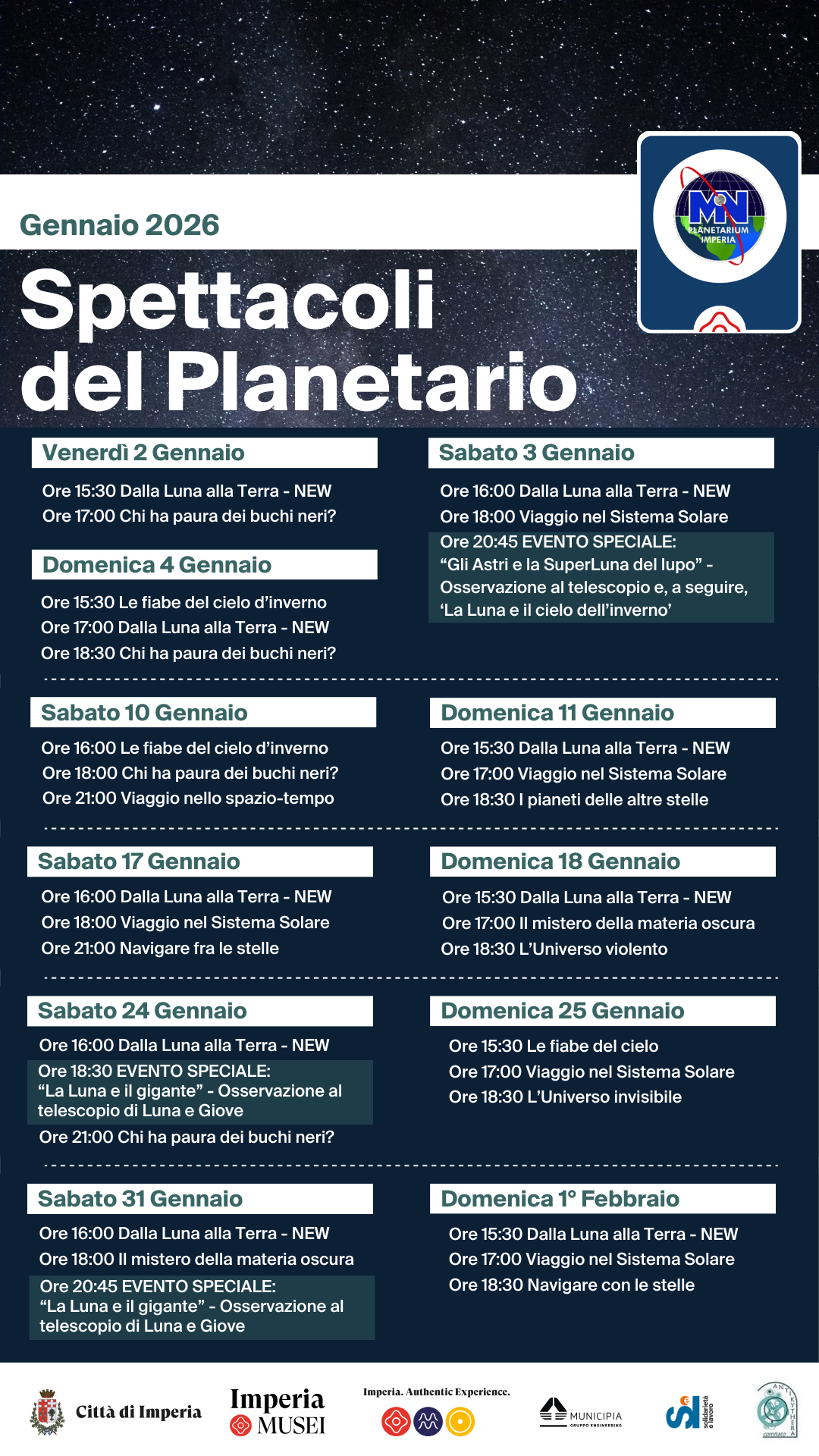 Il Planetario di Imperia offre una ricca programmazione di spettacoli per il mese di Gennaio. Il Comitato Antikythera vi accompagnerà durante le proiezioni e gli eventi speciali alla scoperta dell'universo e dei suoi segreti.