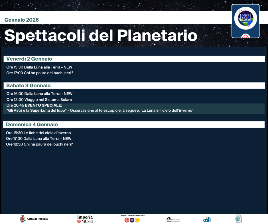 Il Planetario di Imperia offre una ricca programmazione di spettacoli trasmessi ad altissima qualità, guidati dalle voci del Comitato Antikythera, che vi accompagnerà durante le proiezioni e gli eventi speciali alla scoperta dell'universo e dei suoi segreti.