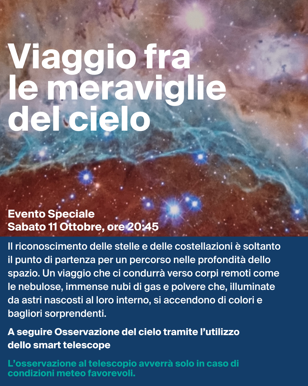 Sabato 11 ottobre alle 20:45 si terrà uno speciale spettacolo in cui il riconoscimento delle stelle e delle costellazioni sarà solo l’inizio di un viaggio nelle profondità dello spazio, alla scoperta di corpi celesti lontani come le nebulose, immense nubi di gas e polvere che si illuminano di luce e colore grazie agli astri nascosti al loro interno.